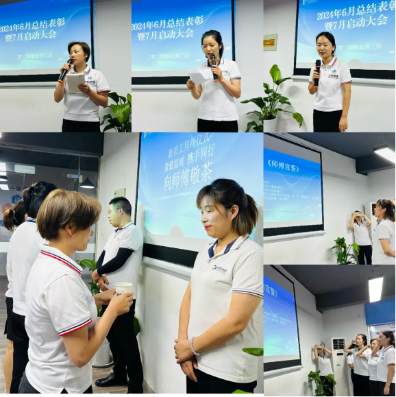 6月新進員工依次發(fā)言,分享了入職德隆的感受和收獲。簡單而又莊重的拜師儀式將會議推向高潮。