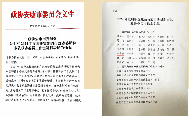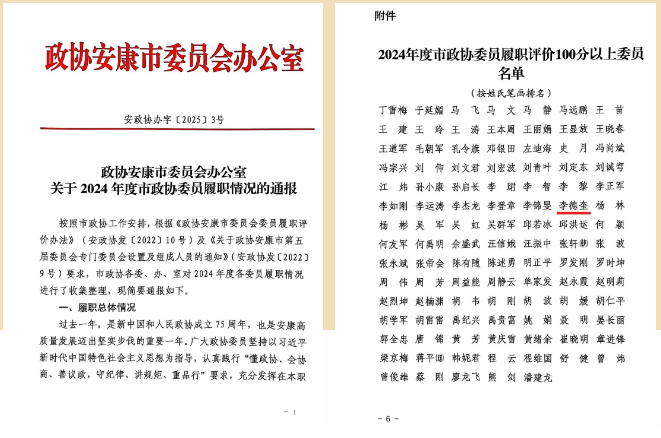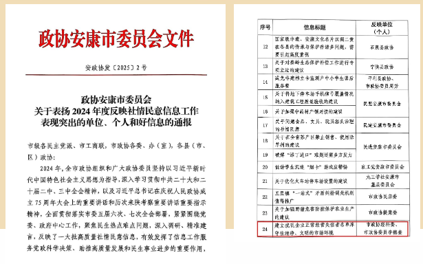 2月8日上午,政協(xié)安康市第五屆委員會第四次會議在安康國際會議中心隆重開幕,來自全市各條戰(zhàn)線的市政協(xié)委員齊聚一堂,認(rèn)真履行政治協(xié)商、民主監(jiān)督、參政議政職能,為全市經(jīng)濟社會高質(zhì)量發(fā)展真誠協(xié)商、建言資政、凝聚共識。在《政協(xié)安康市委員會關(guān)于對2024年度履職突出的市政協(xié)委員和市縣政協(xié)委員工作室進行表揚的通報》中,安康德隆公司總經(jīng)理李德奎被評為2024年度“履職突出的市政協(xié)委員”。在《政協(xié)安康市委員會辦公室關(guān)于2024年度市政協(xié)委員履職情況的通報》中,安康德隆公司總經(jīng)理李德奎被評為“履職評分100分以上委員”。在《政協(xié)安康市委員會關(guān)于表揚2024年度反映社情民意信息工作表現(xiàn)突出的單位、個人和好信息的通報》中,安康德隆公司總經(jīng)理李德奎撰寫提出的《建立擾亂企業(yè)正常經(jīng)營失信者名單庫守住清凈、文明的市場環(huán)境》被評為“2024年度好社情民意信息”。